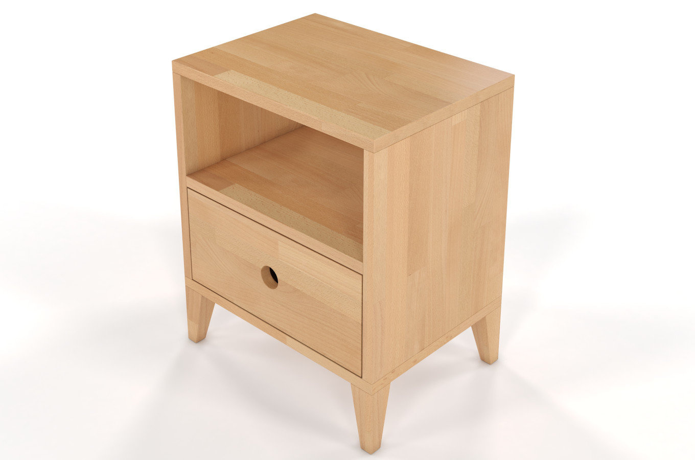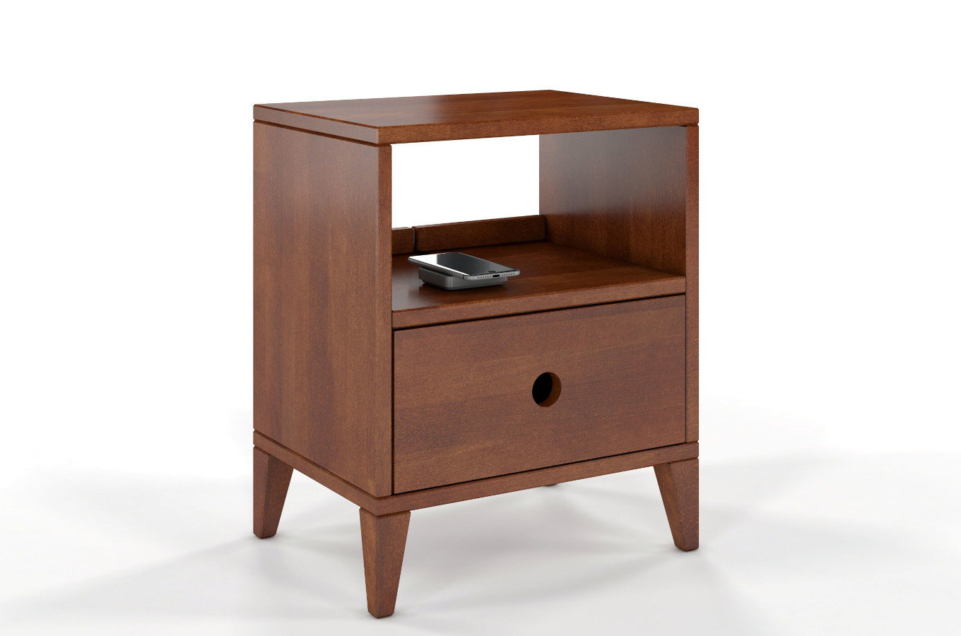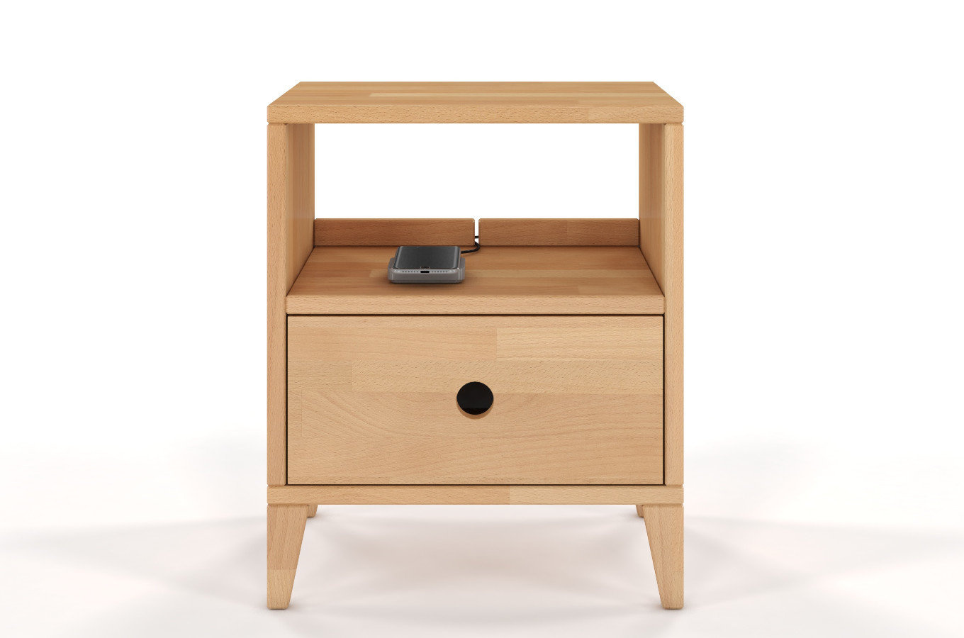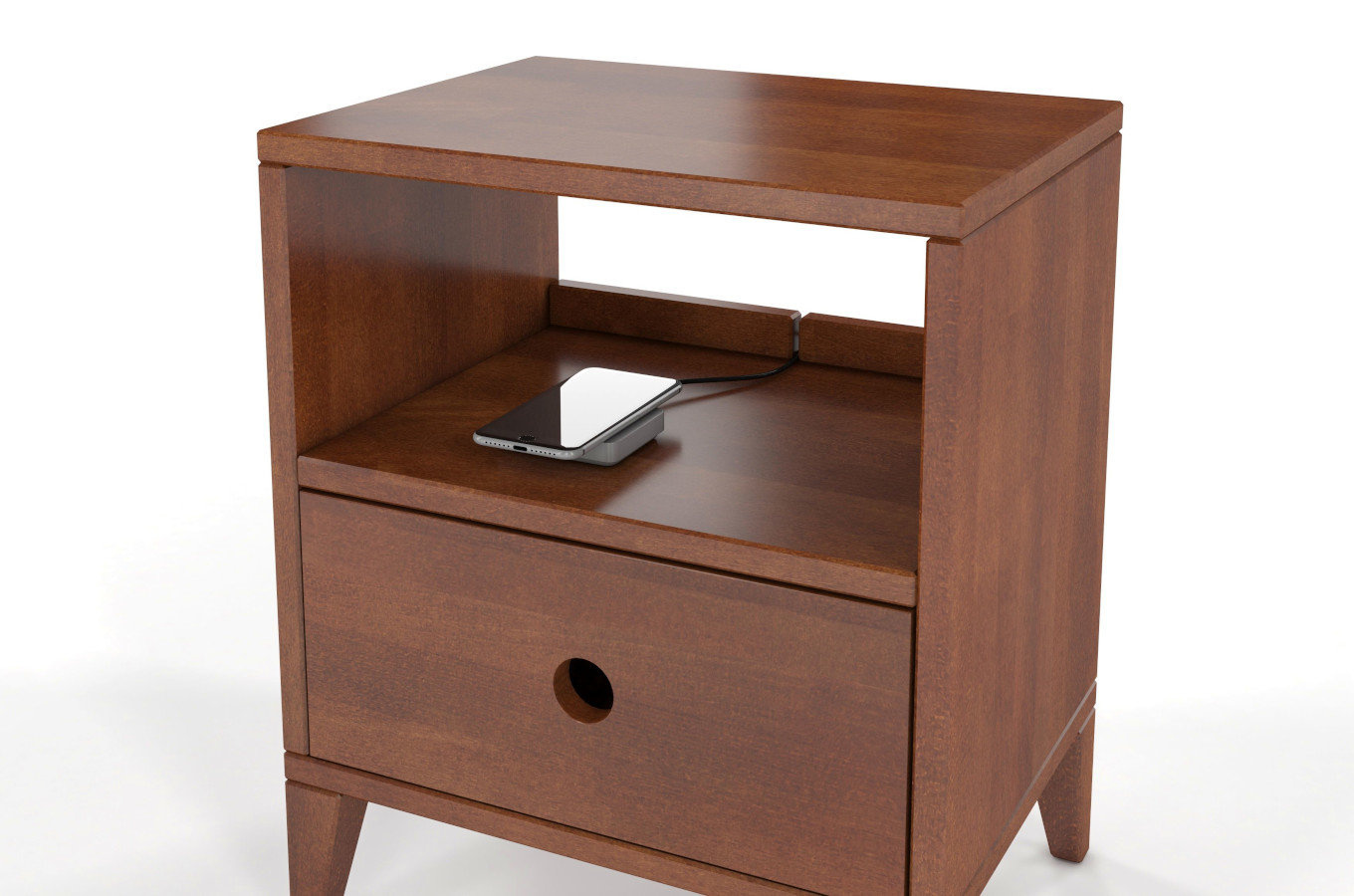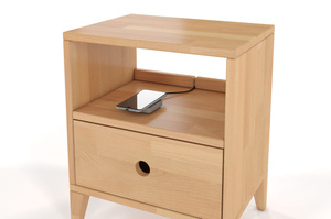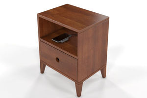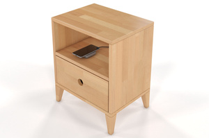 Drewniana szafka nocna Skandica SUND to solidnie wykonany, wytrzymały mebel na lata. Przyciąga uwagę nowoczesną formą i lekkim, nienarzucającym się stylem. Szafka została wyposażona w szufladę, którą otwiera się przy użyciu nawierconego we froncie otworu. Nad szufladą znajduje się praktyczna półka zabezpieczona od tyłu listwą, która zapobiega zsunięciu umieszczonych tam przedmiotów do tyłu. Nowatorskim i niezwykle funkcjonalnym rozwiązaniem jest wycięcie w listwie, przez które można swobodnie przeprowadzić przewód do ładowarki. Bryła szafki nocnej Skandica SUND wspiera się na ukośnie ściętych drewnianych nogach, które dzięki odpowiedniej wysokości są praktyczne - bez problemu można wyczyścić pod szafką podłogę.