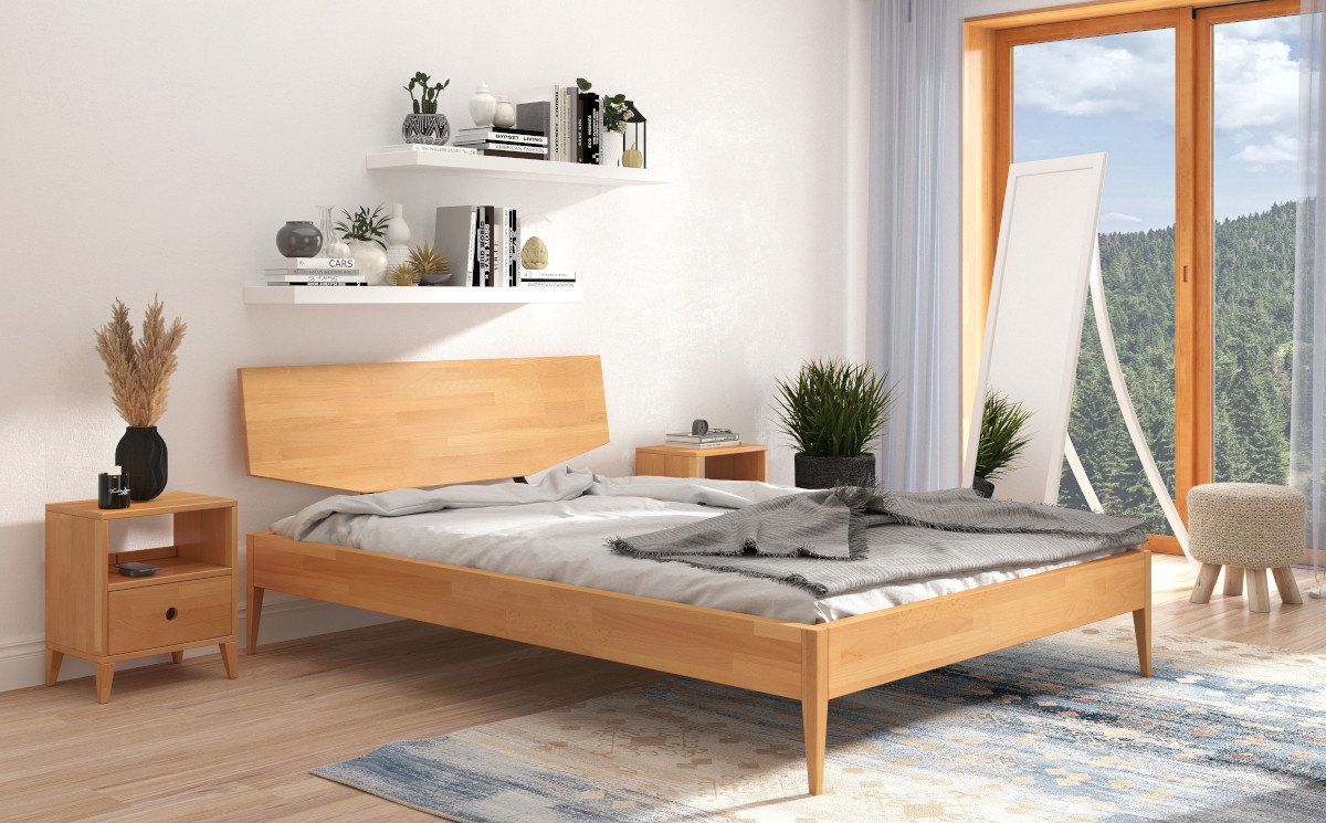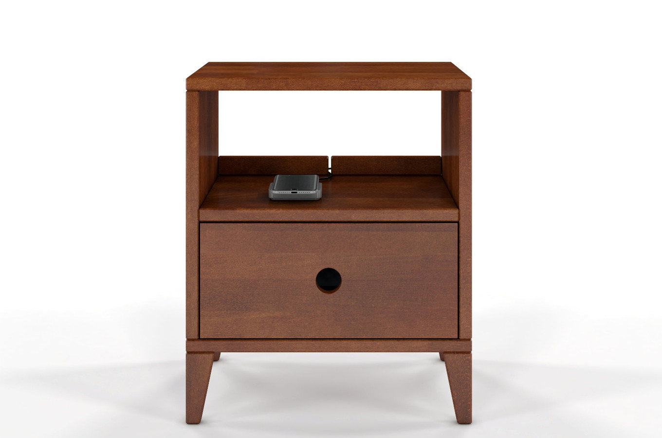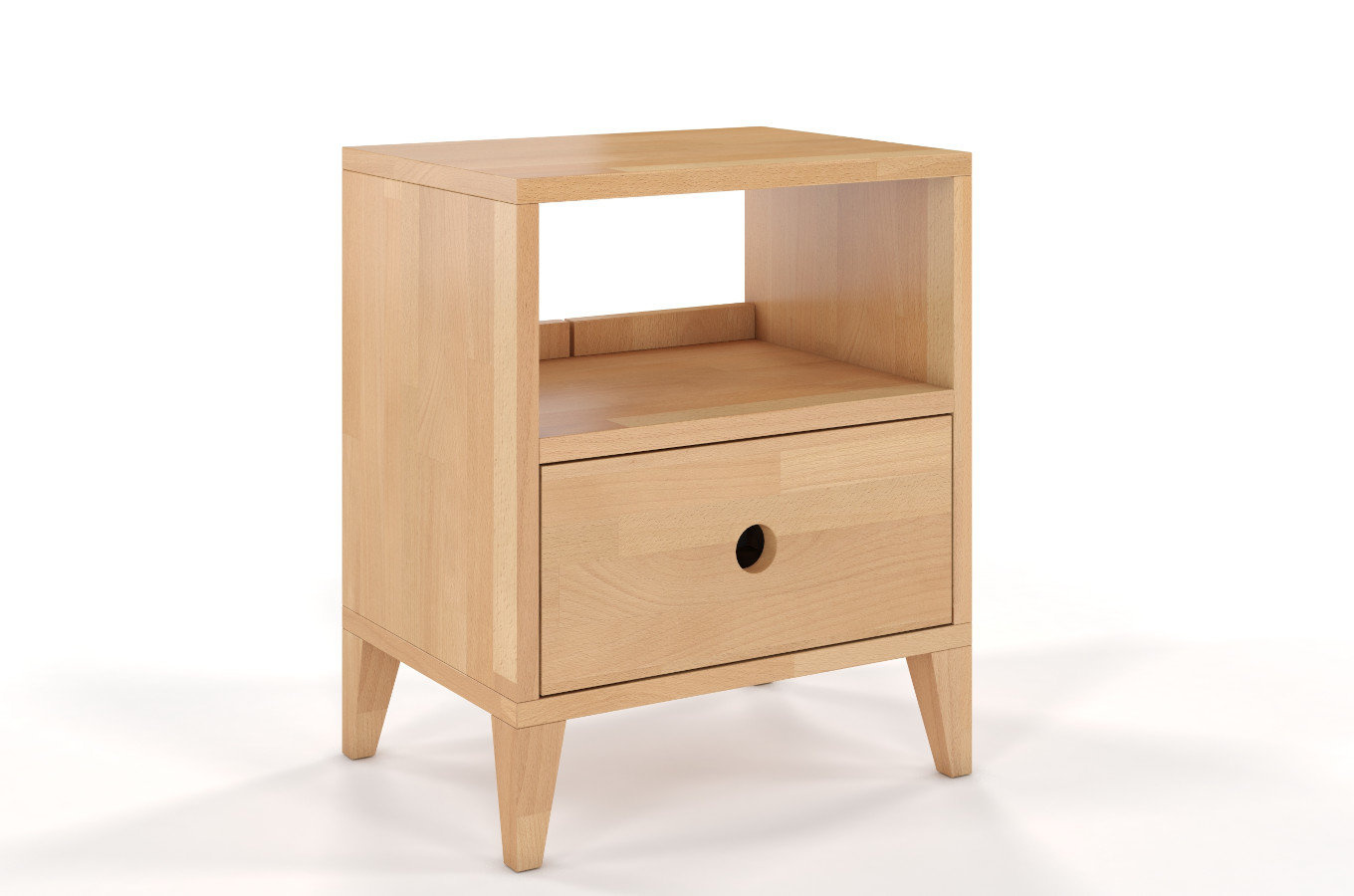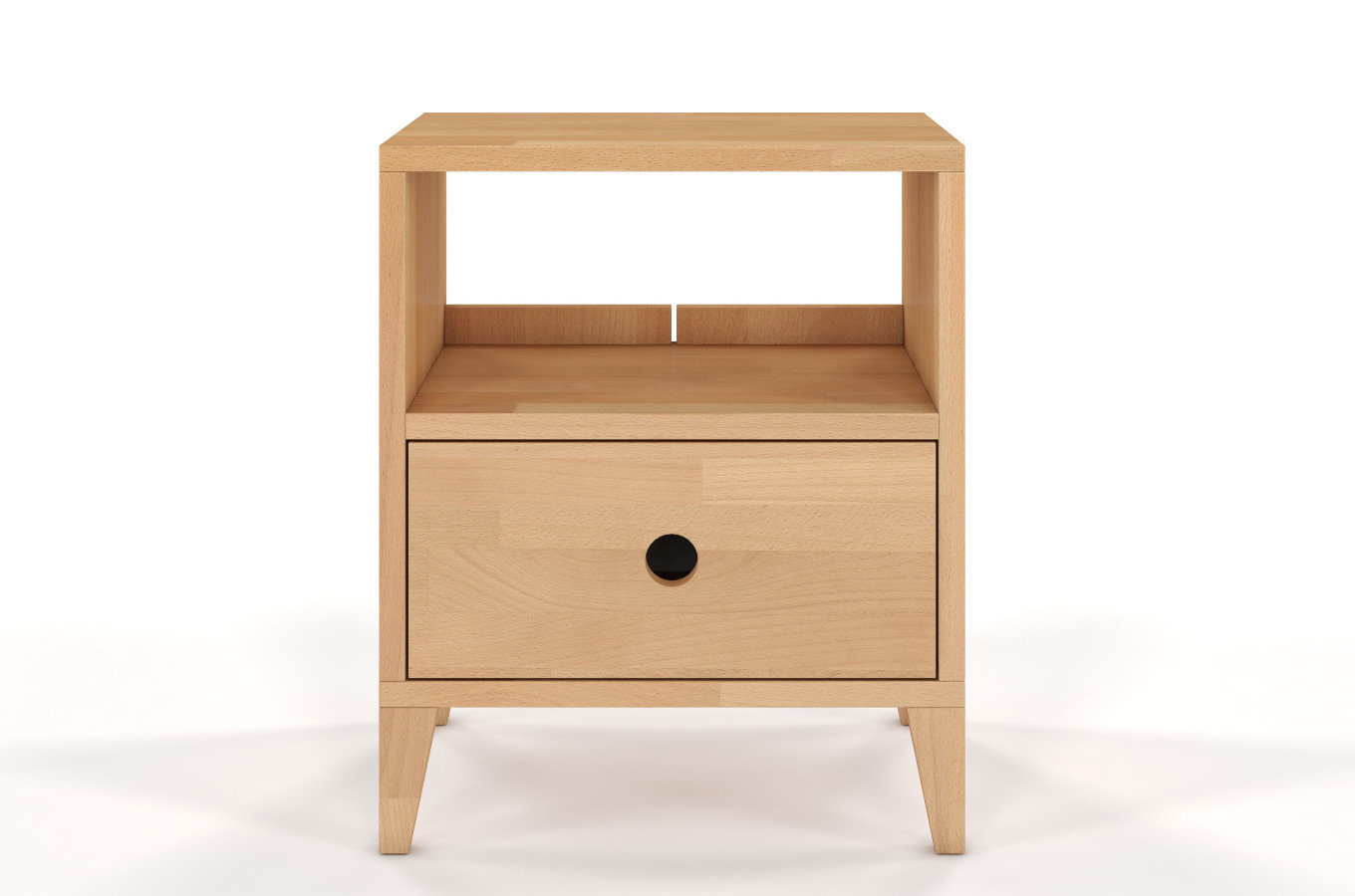 Drewniana szafka nocna Skandica SUND to solidnie wykonany, wytrzymały mebel na lata. Przyciąga uwagę nowoczesną formą i lekkim, nienarzucającym się stylem. Szafka została wyposażona w szufladę, którą otwiera się przy użyciu nawierconego we froncie otworu. Nad szufladą znajduje się praktyczna półka zabezpieczona od tyłu listwą, która zapobiega zsunięciu umieszczonych tam przedmiotów do tyłu. Nowatorskim i niezwykle funkcjonalnym rozwiązaniem jest wycięcie w listwie, przez które można swobodnie przeprowadzić przewód do ładowarki. Bryła szafki nocnej Skandica SUND wspiera się na ukośnie ściętych drewnianych nogach, które dzięki odpowiedniej wysokości są praktyczne - bez problemu można wyczyścić pod szafką podłogę.