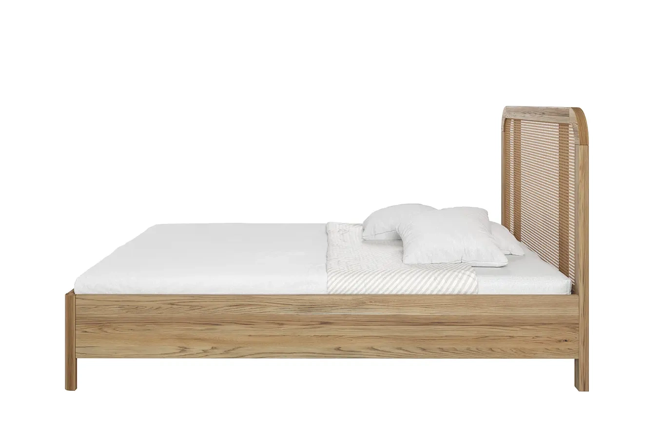 Drewniane łóżko do sypialni z rattanowym zagłówkiem