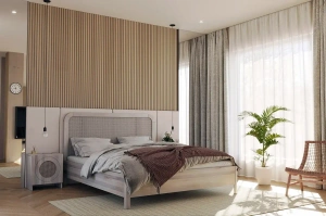 Drewniane łóżko do sypialni z rattanowym zagłówkiem