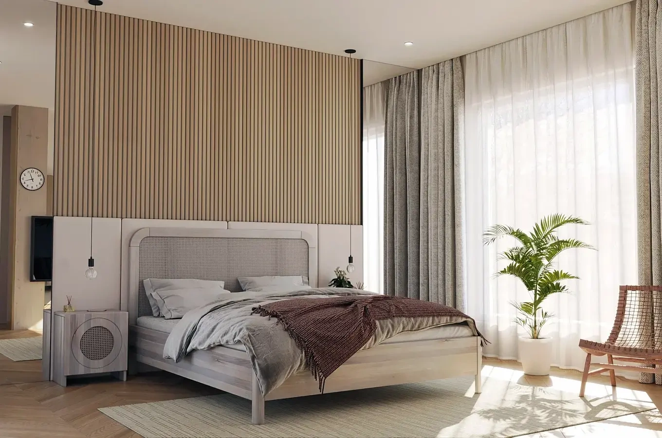 Kolekcja dębowych mebli do sypialni z dodatkiem rattanu