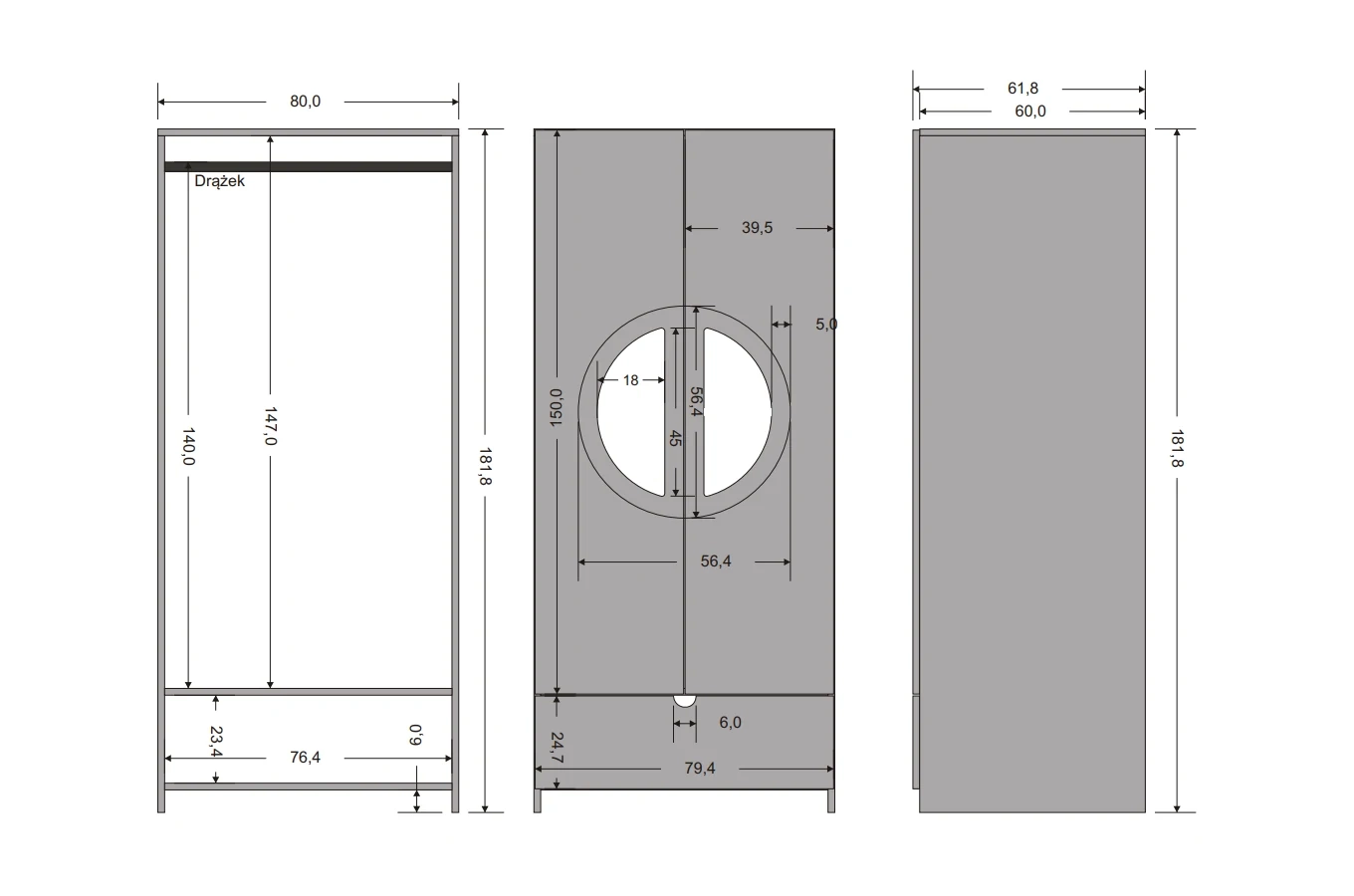• Wymiary wewnętrzne - za drzwiami: 76,4 x 147 cm (szerokość x wysokość)