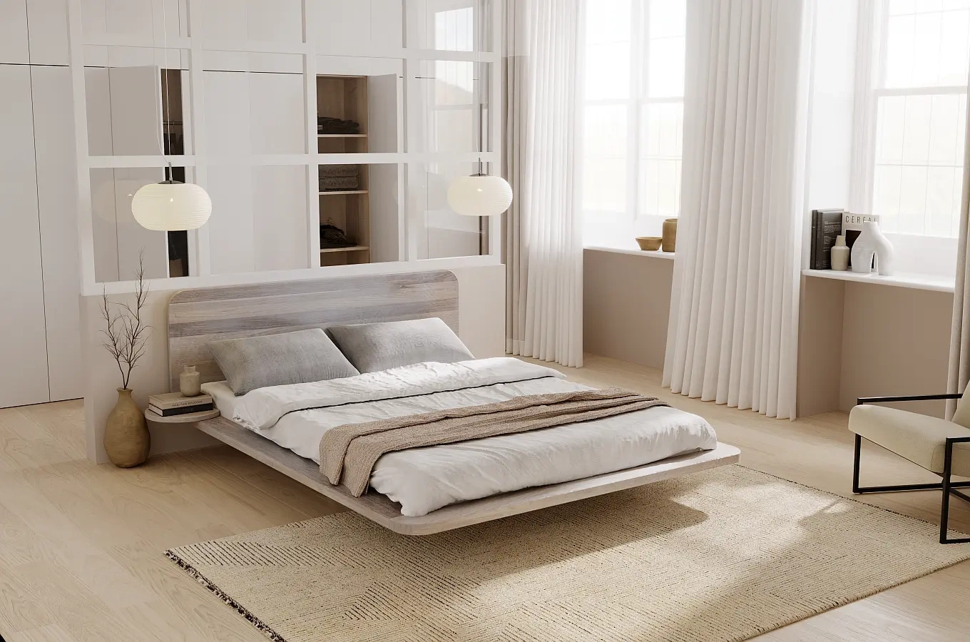 Nowoczesne łóżko drewniane w niezwykle modnym klimacie Japandi. Umiejętnie łączy powściągliwość w doborze dodatków oraz zamiłowanie do naturalnych barw i surowców.