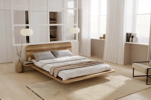 Nowoczesne łóżko drewniane w niezwykle modnym klimacie Japandi. Umiejętnie łączy powściągliwość w doborze dodatków oraz zamiłowanie do naturalnych barw i surowców.
