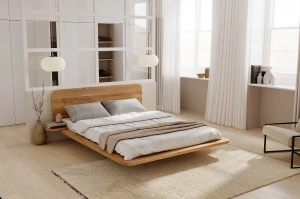 Nowoczesne łóżko drewniane w niezwykle modnym klimacie Japandi. Umiejętnie łączy powściągliwość w doborze dodatków oraz zamiłowanie do naturalnych barw i surowców.